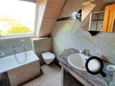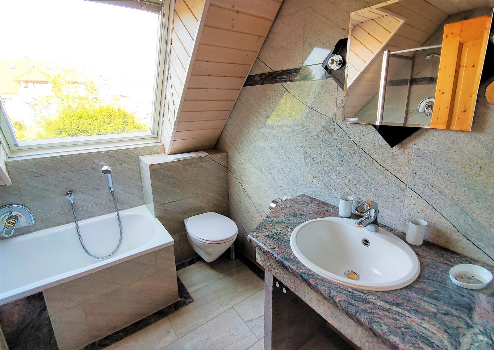 Das hochwertige Badezimmer ist komplett in Naturstein gestaltet und verwöhnt Sie mit einer Fussbodenheizung. Die separate Dusche oder Badewanne bietet Erholung pur.